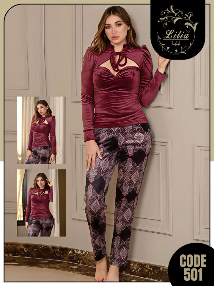 طقم بيت شيك قطعتين خامة مخمل + بنطلون مطبوع – Code 501
