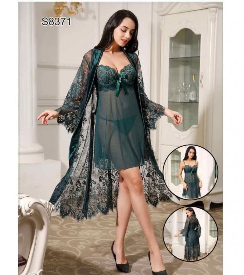 تميزي بإطلالة راقية ومثيرة في نفس الوقت مع هذا الطقم الفاخر المكون من قميص نوم شيفون شفاف بلون أخضر زمردي مع تطريز دانتيل ناعم، وروب طويل أنيق بأكمام واسعة من نفس قماش الدانتيل المزخرف، يمنحك مظهرًا ساحرًا وراقيًا.