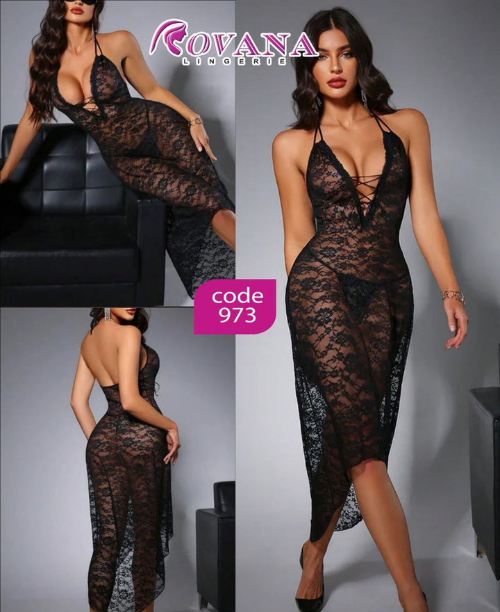 فستان لانجري دانتيل أسود طويل – تصميم مفتوح بحمالات | CODE 973