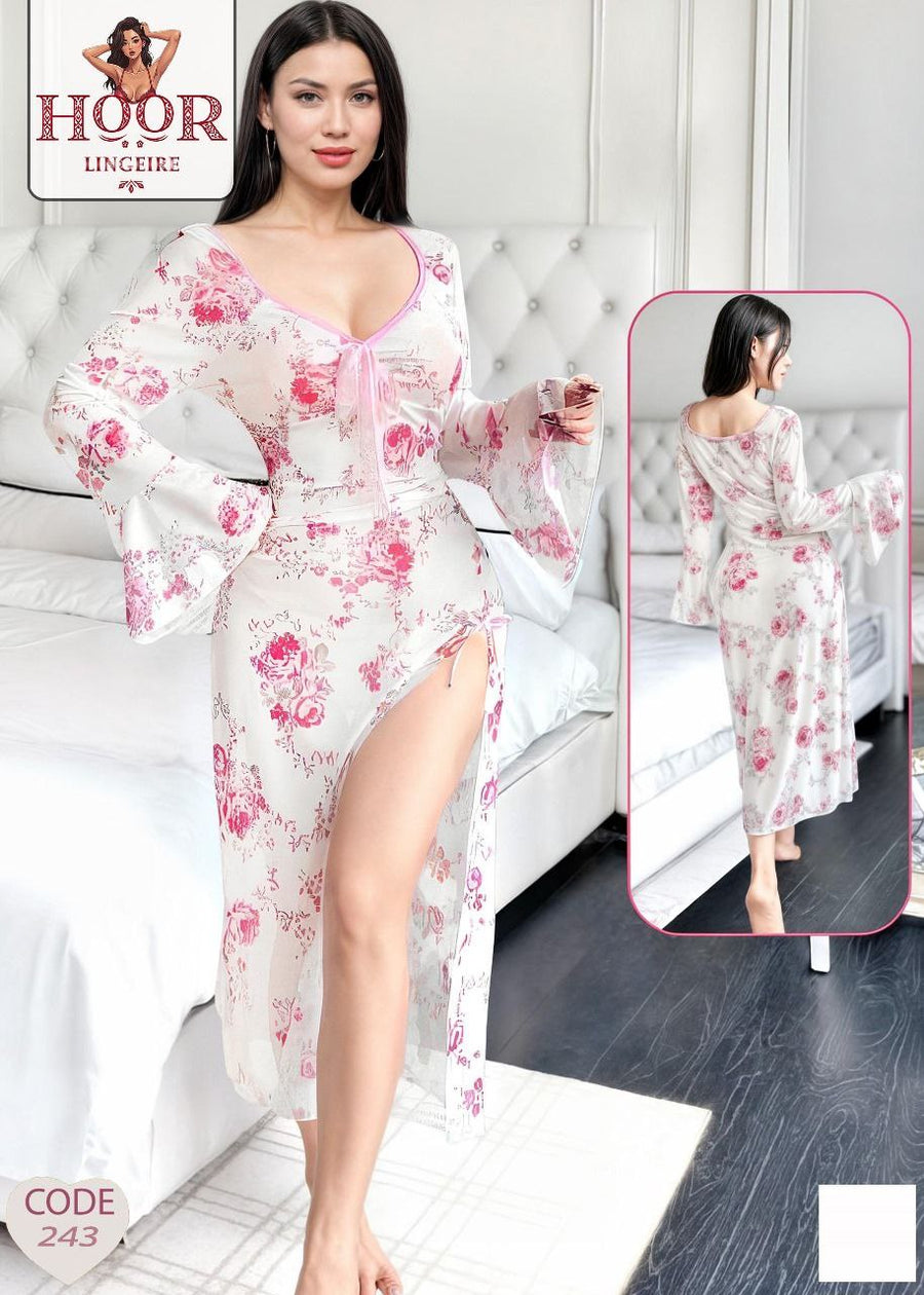 قميص نوم وردي وأبيض مطبوع بزهور، بأكمام واسعة وفتحة جانبية.