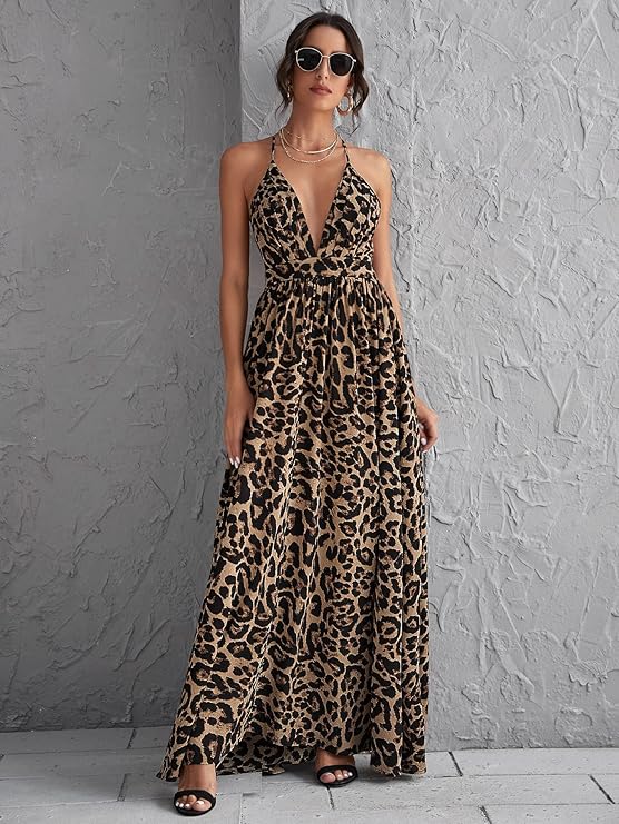 VCAY Plunge Neck Crisscross Open Back Leopard Dress